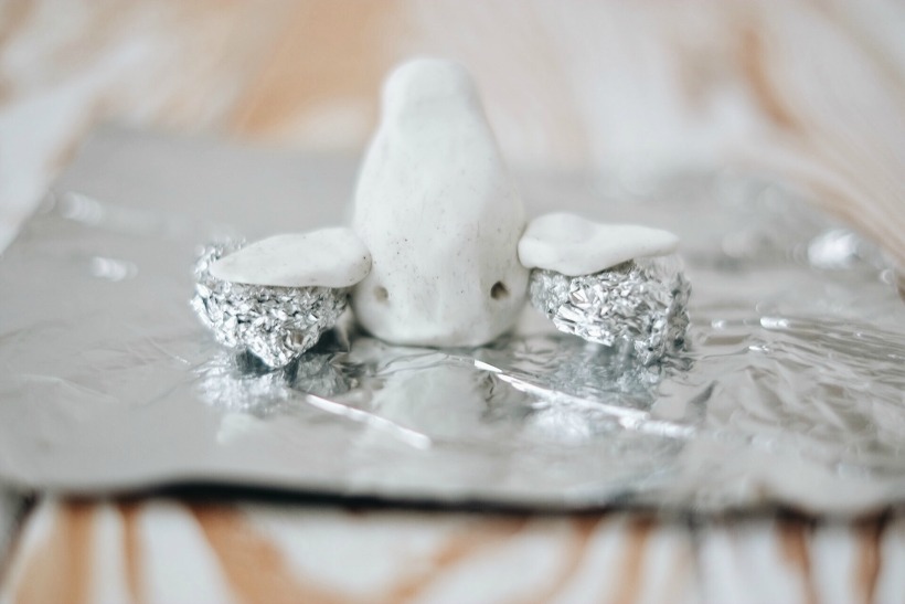 5. Отправляем заготовку в разогретую духовку на 20 минут. Время и температура запекания изделия обычно написаны на упаковке с полимерной глиной. Чтобы уши оленя не прогнулись во время запекания, можно подложить под них небольшие кусочки скомканной фольги.